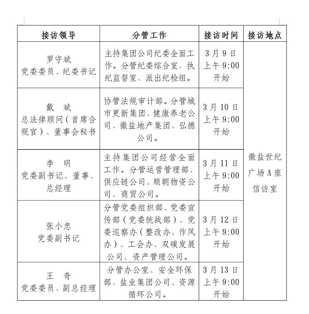 根據工作安排,現就省生態環境集團領導班子成員3月份接待群眾來訪安排公示如下:
